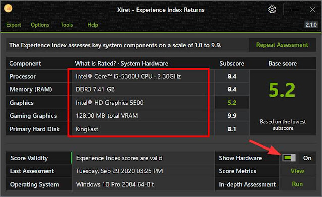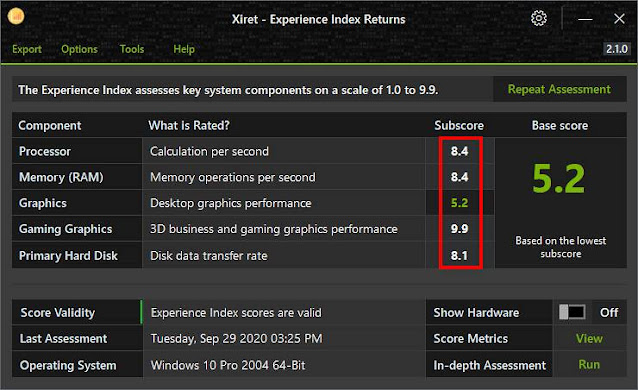 برنامج Xiret مجاني ومفتوح المصدر وحديث على الساحة للويندوز ومتوفر بنسخة محمولة ويمكنك من تقييم قوة وأداء الكمبيوتر عبر معرفة سكور لسرعة المكونات الصلبة الأساسية. قم بتحميل البرنامج من الرابط أسفل التدوينة وبعد تشغيل البرنامج ستحصل على سكور لسرعة المكونات الصلبة الأساسية من خيار Subscoreويبدأ من 1.0 إلى 9.9 بحيث كل ما كانت المكونات سريعة ستحصل على تقييم عالي كما يظهر في هذا المثال فأعلى قيمة لرسومات الألعاب وأدنى قيمة لأداء الشاشة