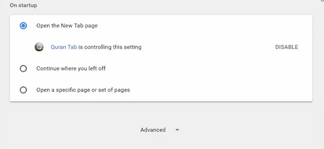 إضافة Quran Tab تقوم بعرض آيات قرآنية للتذكرة بشكل يومي وتساعدنا على فعل الطاعة بشكل لا واعي مع الوقت كما أنها توفر بعض الإضافات والخيارات الرائعة. ثم بتثبيت الإضافة على المتصفح من الرابط أسفل التدوينة وإذا كنت تُريد روئيتها بشكل تلقائي عند فتح المتصفح توجه لإعدادت المتصفح Settings وابحث عن مربع On startup وقم بإختيار Open the New Tab page ومنها إختر آداة قرآن تاب Quran Tab وكذلك يُمكنك روئيتها يوميا عند القيام بفتح جوجل كروم بشكل مُتكرر أو حتى عند فتحك لتبويبة جديدة.