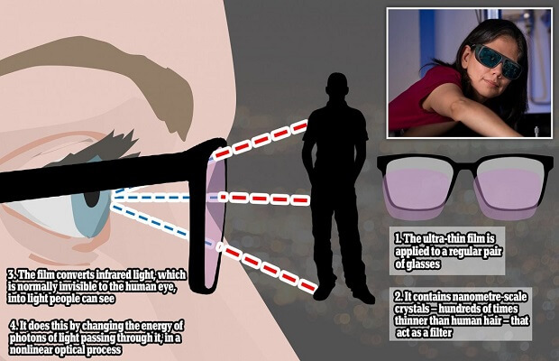 يقول الدكتور روسيو كاماتشو موراليس من الجامعة الوطنية الأسترالية: “لقد جعلنا غير المرئي مرئيًا”. تتيح تقنيتنا تحويل ضوء الأشعة تحت الحمراء ، غير المرئي عادة للعين البشرية ، إلى صور يمكن لأي شخص رؤيتها من أي مسافة. ما فعلناه هو تصنيع غشاء رقيق من البلورات المقطوعة بمقياس النانو وأرق بمئات المرات من شعرة الإنسان. عند وضعها على النظارات العادية كما لو كانت مصفاة ، فإنها تتيح لنا الرؤية في الظلام “.