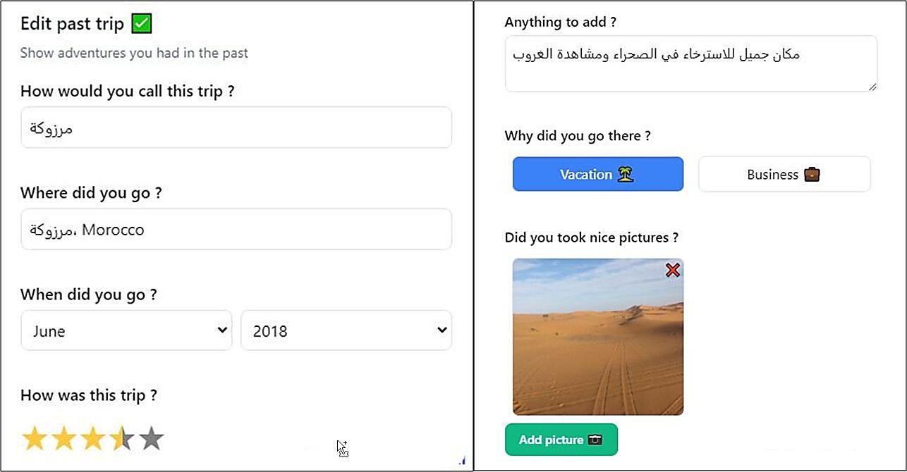فمثلاً عند النقر على زر Add past trip ستحصل على نافذة لإضافة معلومات مثل الاسم، المكان على الخريطة، تاريخ السفر، التقييم الخاص بك للمكان وإضافة صور للمكان عن أي مكان سافرت إليه