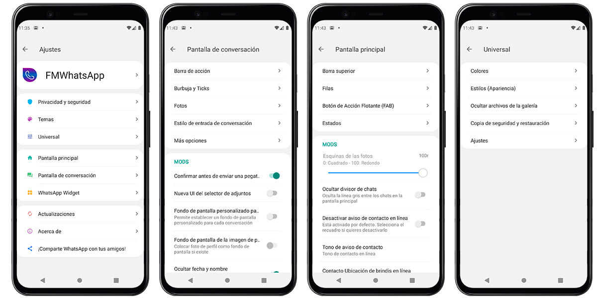 كل شئ مطابق ، حتى قائمة إعدادات MBWhatsApp مماثلة لأي قائمة على آيفون (على الرغم من وجود المزيد من الخيارات). لذلك فهي مسألة تثبيت التطبيق واعتماد المظهر الخاص بواتساب في آيفون على هاتفك أندرويد.