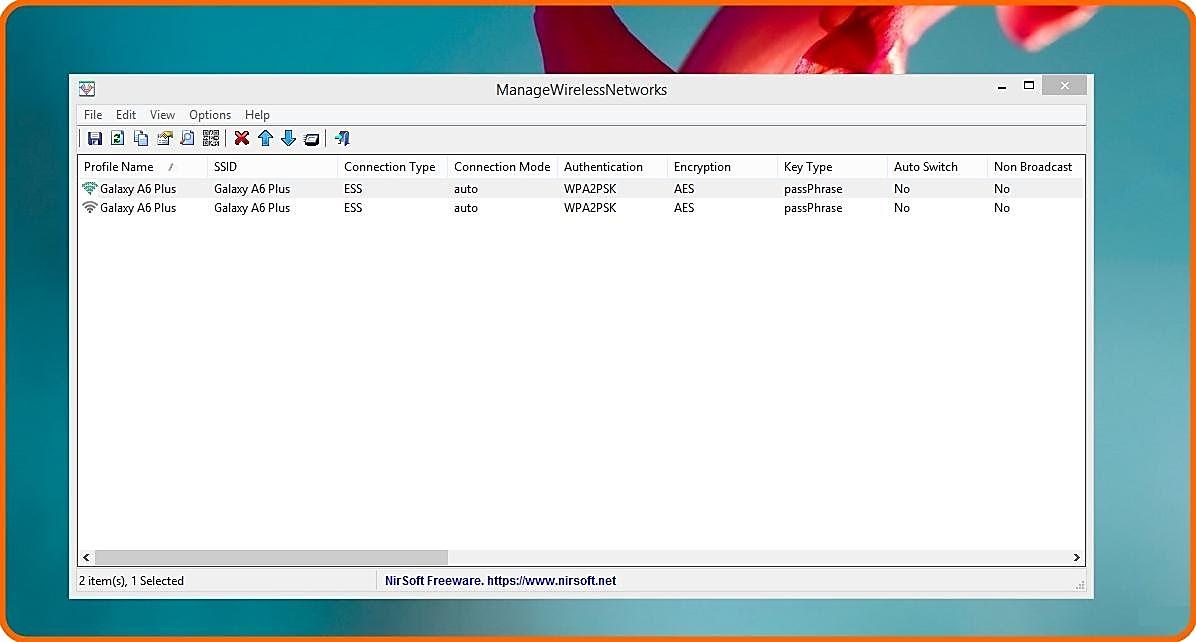أداة ManageWirelessNetworks الرائعة والمجانية والمحمولة من شركة Nirsoft الشهيرة والتي تمكنك من التحقق من حالة الشبكة اللاسلكية الخاصة بك و تحليل قوة وسرعة الإشارة فيها فهي تعتبر بديلاً رائعًا لبرنامج Wireless Network Manager في الويندوزويمكنك تحميلها من الرابط اسفل التدوينة.وبعد فتح الأداة ستجد واجهة بسيطة بها قائمة تعرض جميع شبكات Wi-Fi التي اتصلت بها بالإضافة إلى جميع المعلومات المتعلقة بها مثل بروتوكول الاتصال والوسائل المستخدمة للاتصال بالشبكة ونوع الأمان و تاريخ إضافة الشبكة
