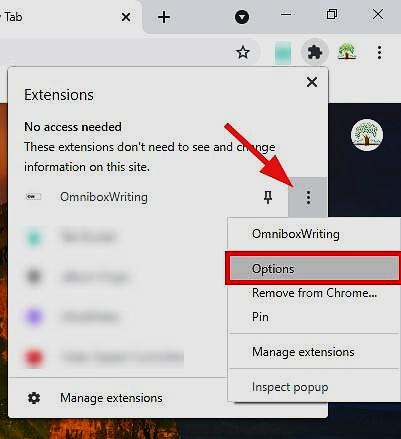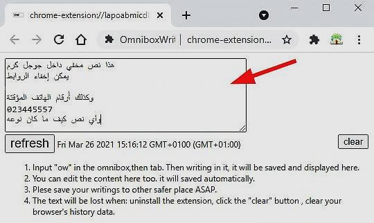 إضافة OmniboxWriting مجانية لمتصفح كروم وتستطيع من خلاله إخفاء أي نص بشكل سري وآمن داخل المتصفح باستخدام أسلوب التمويه لإخفاء النصوص دون الحاجة إلى تشفير أو كلمة مرور فلا أحد يمكن أن يشك أن هناك نص موجود في مكان ما داخل المتصفح. قم بتثبيت الإضافة من الرابط أسفل التدوينة وللدخول إلى صفحة الكتابة أنقر على أيقونتها ثم على خيارات Options