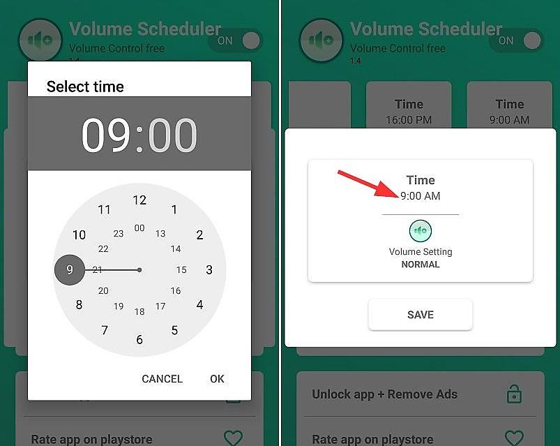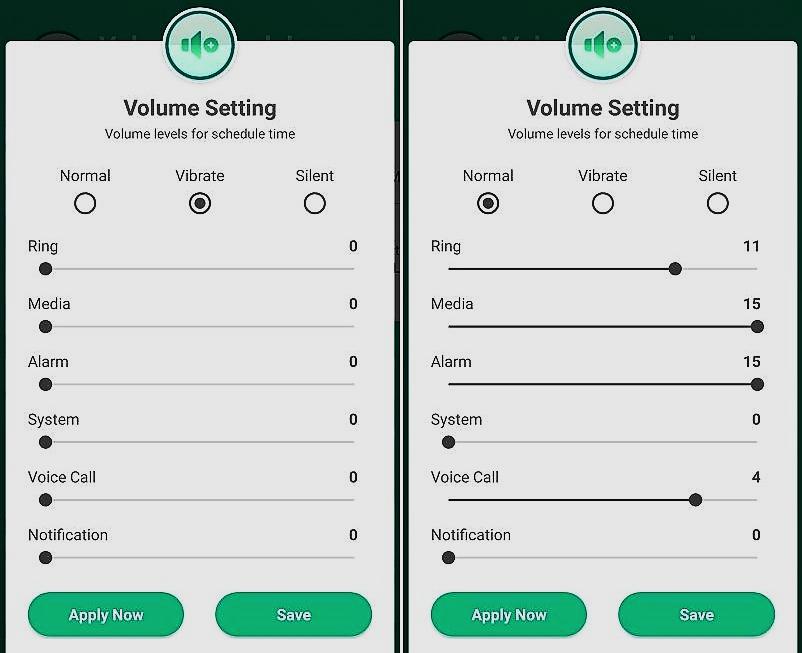 بعد إضافة الوقت أنقر عليه ثم حدد وضع هذا التوقيت سواء عادي “Normal” أو هزاز “Vibrate” أو صامت “Silent” وبإمكانك ضبط مستوى الصوت لكل من الرنين والميديا والمنبه والنظام والإشعارات.