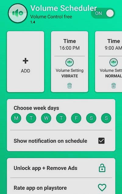 تطبيق Volume Scheduler للأندرويد تستطيع من خلاله التبديل بين أوضاع الرنين تلقائيا حسب أوقات مختلفة من خلال جدولة مستوى الرنين وكذلك الأوضاع التي تريد. قم بتحميل التطبيق من الرابط اسفل التدوينة. وبعد فتح التطبيق ستجد تلك الواجهة البسيطة قم بمنح التطبيق أذونات التعديل على وضع عدم الإزعاج ثم إلمس زر Add لإضافة وقت جديد كما تستطيع التبديل بين الأوضاع طبقاً لأيام الأسبوع من خيار Choose week days.