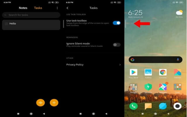 إن كنت من تطبيق notes لتنظيم مهامك اليومية فهذه الميزة ستفيدك كثيرا، حيث أنه تظهر لك إختصار في الشاشة يمكنك من إظهار جميع المهام التي قم بتسجيلها أو تسجيل مهام جديدة دون الحاجة للدخول إلى التطبيق ، فلتفعيلها قم بالدخول إلى إعدادات تطبيق notes ثم فعل خيار use task toolbox كما هو موضح في الصورة :