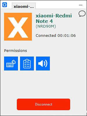 بعد ربط الاتصال يمكنك التحكم في الأذونات التي تريد مشاركتها مع الهاتف مثل لوحة المفاتيح والفأرة أو الحافظة أو الصوت من خلال النافذة التي ستظهر على الحاسوب