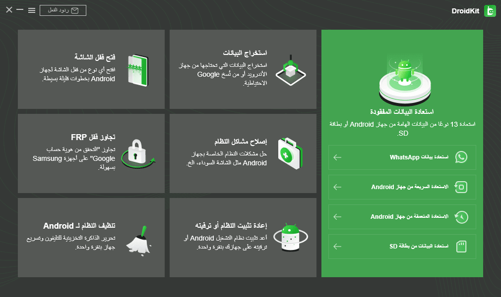 تطبيق DroidKit ليس فقط تطبيق إستعادة البيانات المحذوفة، ولكنه مدير متكامل لهاتفك الأندرويد. حيث يقدم التطبيق حلولاً شاملة لأكثر المشكلات انتشاراً بما في ذلك الشاشة السوداء وتعطل الشاشة وقفل الـFRP على جهاز السامسونج وغيرها. فالتطبيق يعيد الحياة إلى هاتفك مهما كانت مشكلته.