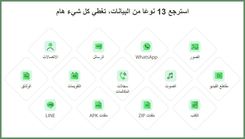 يدعم تطبيق DroidKit إستعادة 13 نوعاً من البيانات على هواتف أندرويد، بما في ذلك الصور ورسائل واتساب، ورسائل تطبيق Line، وجهات الاتصال، وسجلات المكالمات، والمقاطع الصوتية، وحتى بيانات التقويم، والوثائق، والكتب، وملفات ZIP، و AP.