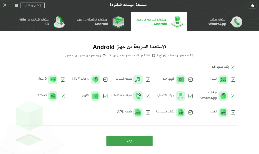 وضع الاستعادة السريعة يقوم بفحص الجهاز بسرعة للعثور على البيانات المفقودة في دقائق، ويسمح باسترجاع المفقود بنقرة واحدة. ولاحاجة لعمل روت للهاتف أو الجهاز اللوحي مع هذا الوضع.