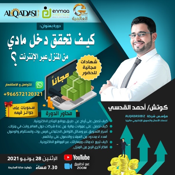 نحن ممكن نساعدك وبالمجان لكن يجب أن تكون جاهز وتحضر معنا على الموعد في دورة عمل بعنوان أسرار الربح من الانترنت مع الكوتش أحمد القدسي. ليس هذا فحسب.. ستحصل أيضاً على شهادة حضور مجانيه وتدخل في السحب على جوائز قيمة.