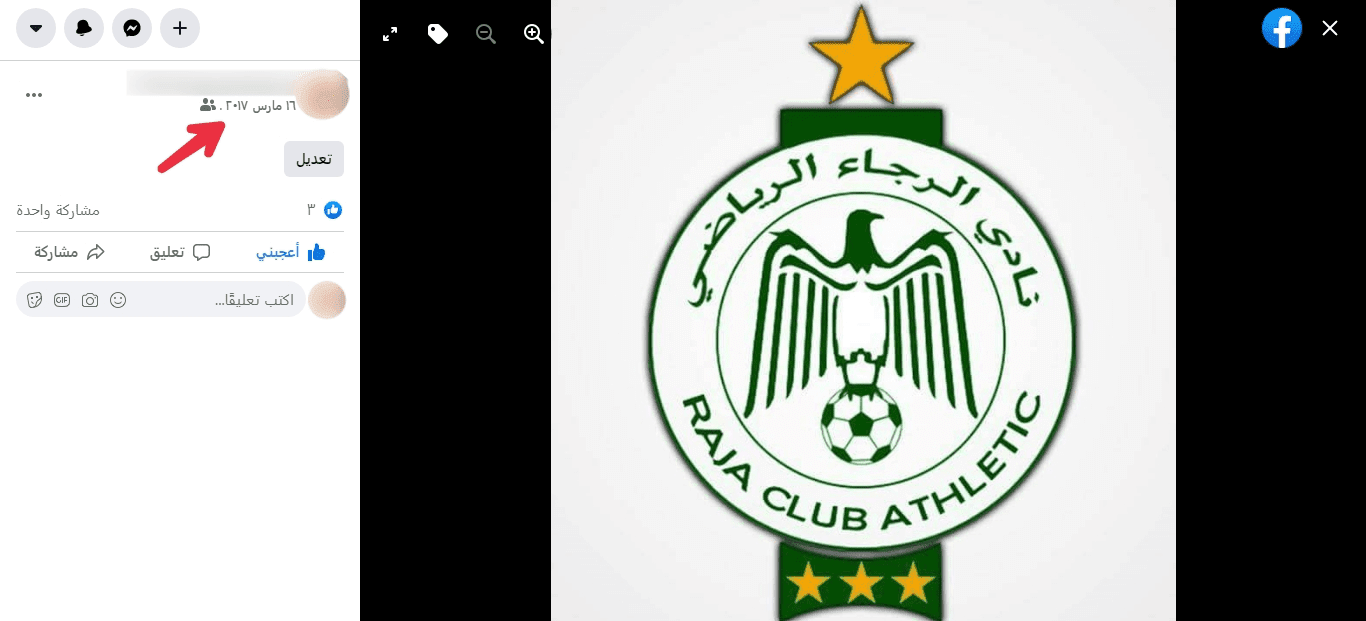 عندما تفتح أقدم صورة لملفك الشخصي بملء الشاشة ، تحقق من تاريخ التحميل على يمين الصورة ، لذلك ، يجب أن يكون هذا التاريخ هو التاريخ الذي أنشأت فيه ملفك الشخصي على حسابك في الفايسبوك.