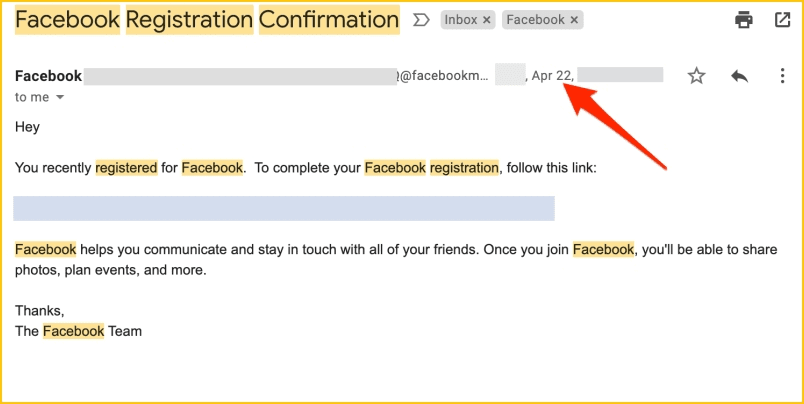 عندما تجد بريد الفايسبوك الإلكتروني الذي يطلب منك تأكيد عنوان بريدك الإلكتروني أو يقدم تعليمات لكيفية بدء استخدام المنصة ، يجب أن يكون تاريخ هذا البريد الإلكتروني هو تاريخ إنشاء حسابك على المنصة.
