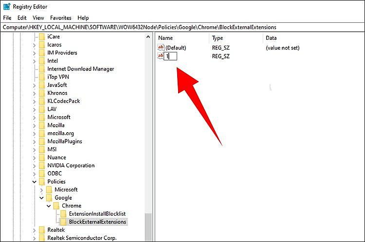 قم بالنقر بالزر الأيمن فوق مجلد BlockExternalExtensions واختر New ثم String Value وقم بتسمية هذه القيمة أيضاً برقم 1