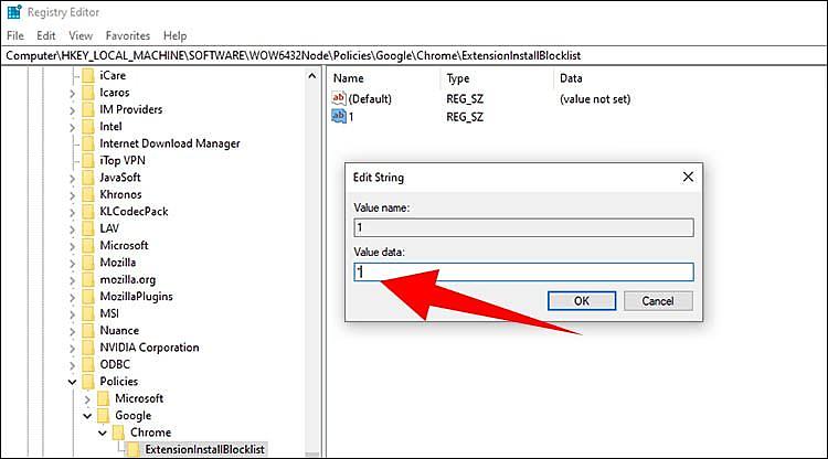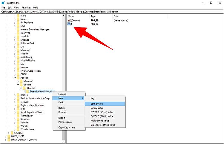 قم بالنقر بالزر الأيمن فوق مجلد ExtensionInstallBlocklist ثم اختر New ثمString Value وقم بتسمية هذه القيمة برقم 1 كما في الصورة