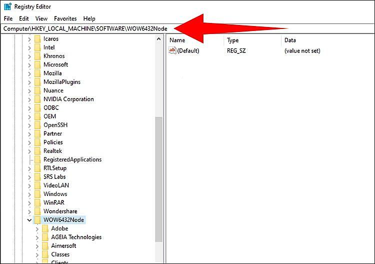 قم بفتح محرر الريجستري بالنقر على Windows + R وكتابة Regedit ثم انقر Ok وتوجه إلى المسار التالي HKEY_LOCAL_MACHINE > SOFTWARE > WOW6432Node