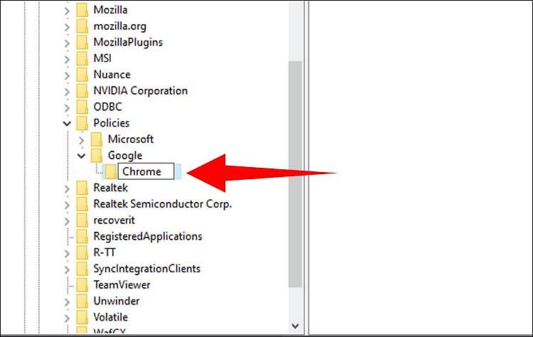 قم بالبحث عن مجلد Polices واضغط بالزر الأيمن ثم اختر New ثم Key وسيتم إنشاء مجلد جديد قم بتسميته Google ثم انقر على مجلد Google بزر الفأرة الأيمن واختر New ثم New Key وقم بتسميته Chrome
