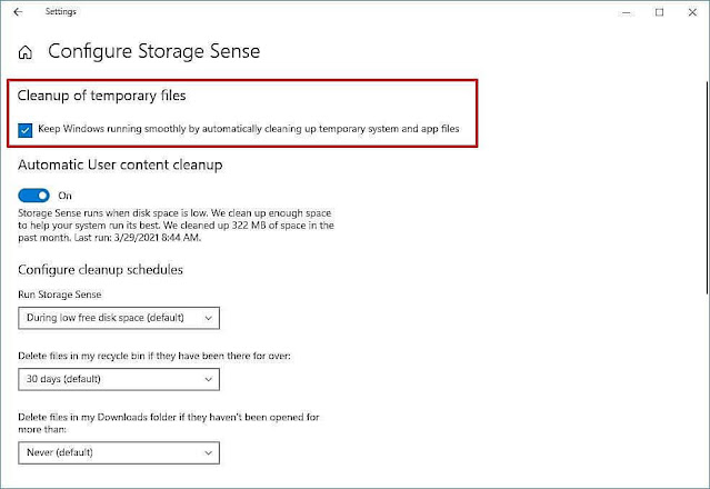 سيقوم ويندوز 10 بفحص الهارد وإيجاد الملفات المؤقتة التي لم تُستخدم منذ فترة وسيقوم بحذفها ولتفعيل هذه الميزة من الإعدادات انتقل إلى قسم System ثم Storage واضغط على Configure Storage Sense لتجد خيار “Keep Windows running smoothly…..”