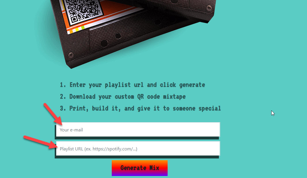 Send a Mixtape هي بوابة ، كما يوحي اسمها ، تقدم طريقة فريدة لمشاركة قوائم تشغيل الموسيقى. على وجه الخصوص ، يوفر القدرة على إنشاء قالب قابل للطباعة من شريط قابل للطي ، والذي يمكنك قصه وتجميعه على نطاق واسع. على ملصقه ، يحتوي على رمز الاستجابة السريعة الذي عند توجيه الكاميرا إليه أو قراءته بتطبيقات QR يعيد التوجيه إلى القائمة التي قمنا بإنشائها.