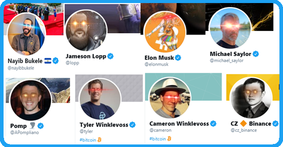 هدا يسمى ميم عيون الليزر إنها مرتبطة بعملة  البيتكوين، وقد يشير ذلك إلى أن الشخص الذي وضعها قد اشترى البيتكوين أو ينوي شرائه، وأيضا يؤمن بان البيتكوين قد يصل ل 100 ألف دولار وأكثر، ويرمز  لها كدالك بالقوة الخارقة والتحكم  وسيطرة البيتكوين على عالم المال.
