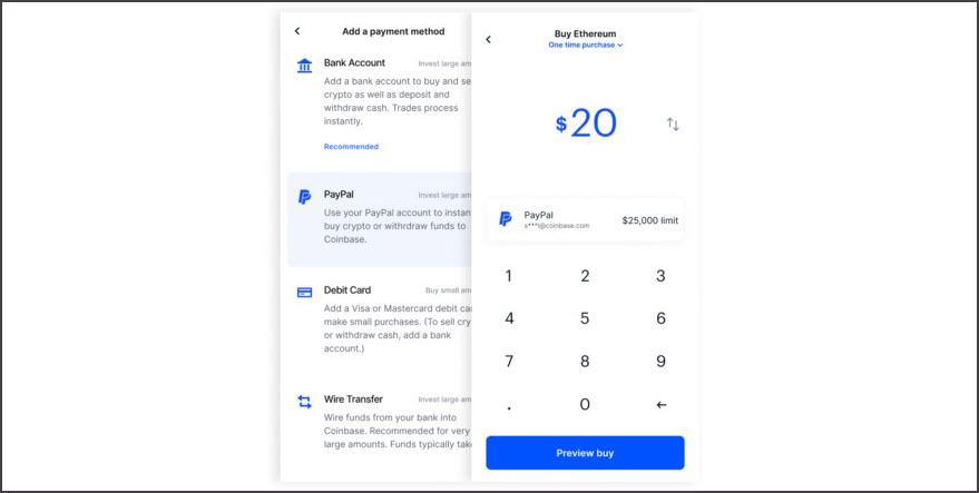 شركة Coinbase قدمت في بيانها الحديث أنه اذا امتلكت حساب بايبال يمكنك إجراء المعاملات على الفور، وهذا لن يحتاج الى إضافة رقم بطاقة الفيزا مباشرة، مما يتيح لك إدارة لمعلوماتك بشكل آمن.