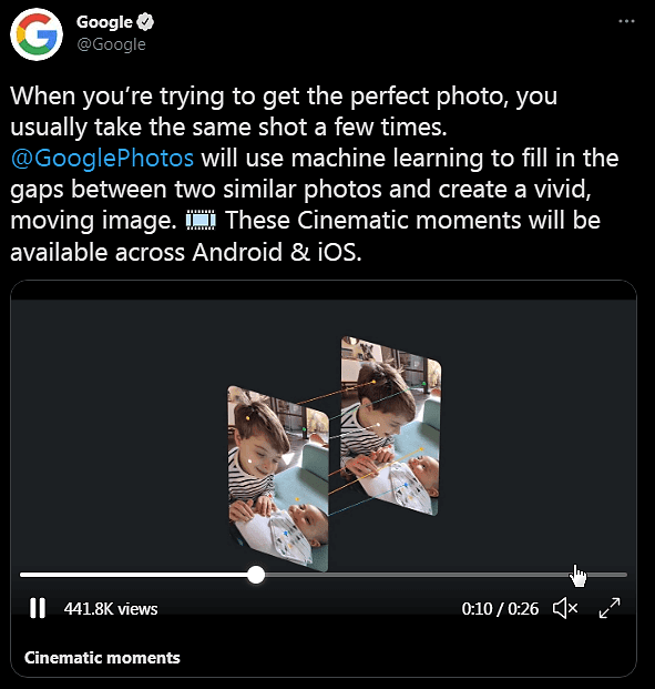 شركة جوجل من اكبر الشركات في معظم المجالات التقنية حيث تقوم بالعمل على أي مشروع حتى يستحوذ على السوق الخاص به ومن ضمن تلك المشاريع تطبيق صور جوجل والذي يتم تطويره بشكل كبير كما تعمل جوجل على تقنيات الذكاء الاصطناعي و التعلم الآلي لتقديم لتحسين خدماتها وجعلها أكثر جذبا للمستخدمين ومن ضمن تلك التطورات تقنية جديدة خاصة بمجال الصورة تحمل إسم Cinematic Moment.