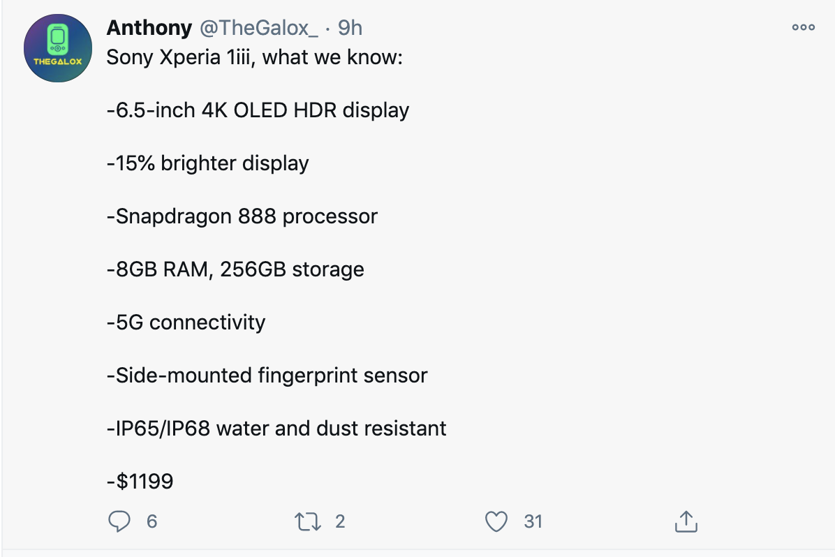 مصدر الخبر لم يكشف عن صور للتصميم ، حيث لم يعرض سوى ورقة بخصائص الجهاز. ما يمكننا معرفته ، في الوقت الحالي ، هو أن هاتف Sony Xperia 1 III سيصل كواحد من أكثر الهواتف المتطورة اكتمالاً في السوق. سيكون أيضًا من أغلى الأسعار ، حيث يتحدث التسريب عن تكلفة تبلغ 1199 دولارًا. هذا ما نعرفه عنه: