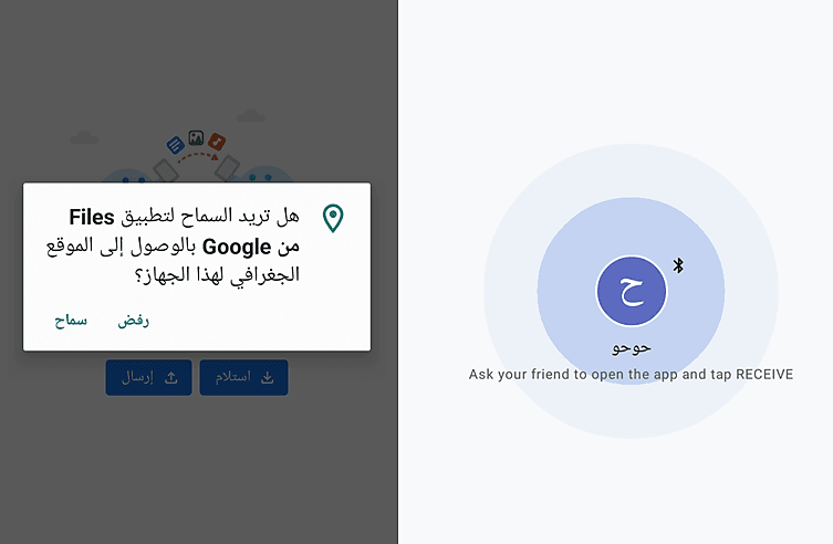 بعد ذلك سيطلب منك منحه بعض الأذونات ليبدأ البحث عن المستلمين . قم بالضغط على إستلام في الجهاز الآخر
