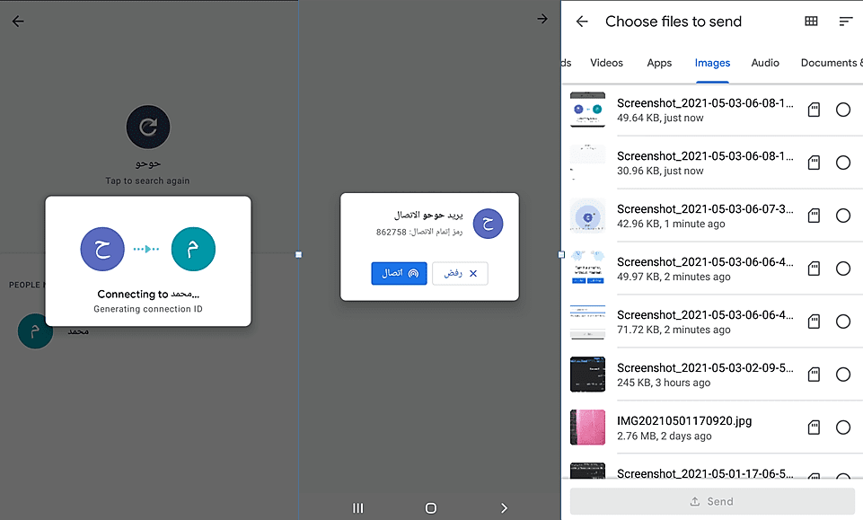 ستلاحظ ظهور الجهاز المستلم باسم المستخدم في القائمة اضغط عليه ليتم طلب الربط بين الجهازين . وافق على الإتصال من الجهاز المستلم ليبدأ الإتصال بكل سلاسة ثم قم بإختيار الملفات التي تريد إرسالها ويمكنك إرسال ملفات بالعكس أي من جهاز المستلم