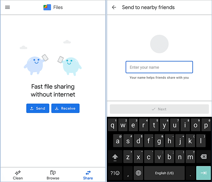 تطبيق ملفات جوجل Google Files لإدارة الملفات على الهاتف ويدعم الثيم الأسود وتم تحميله أكثر من مليار مرة من جوجل بلاي ويدعم جميع إصدارات الاندرويد وإن لم يوجد على هاتفك يمكنك تحميله من الرابط أسفل التدوينة.بعد فتح التطبيق قم بالدخول لقسم المشاركة Share ثم اضغط إرسال أو استلام كما تريد وسوف يطلب منك إدخال اسم مستخدم أول مرة فقط