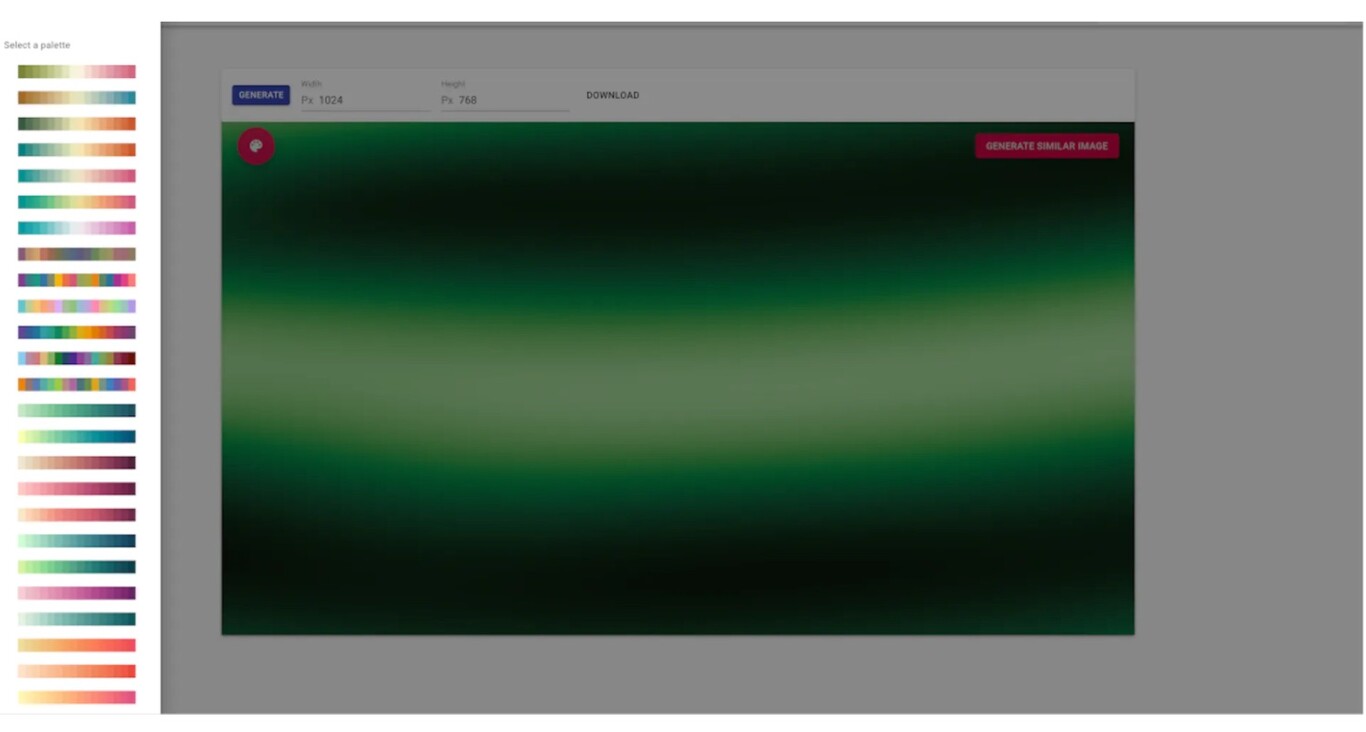 إذا نقرنا على لوحة الألوان ، فسيتم فتح قائمة جانبية تتيح لنا اختيار لوحات ألوان مختلفة. الزر الأزرق الذي يقول “generate ” هو المسؤول عن إنشاء صورة تجريدية عشوائية ، وعندما يكون لدينا صورة نحبها ، يمكننا الضغط على “generate similar image ” للحصول على صور أخرى مماثلة.