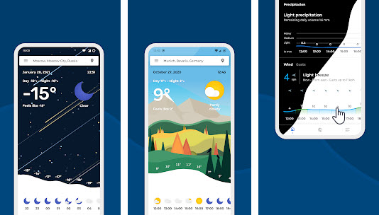 إنه تطبيق ذو جمالية حديثة تستند واجهته على  Material Design من  غوغل ، ويراهن على الرسوم المتحركة والعناصر المذهلة لعرض حالات الطقس في هاتفك .