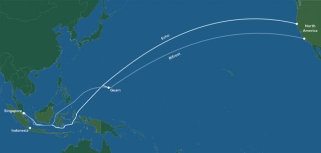 كما ذكرنا ، يشارك فيسبوك و غوغل في المسارات الجديدة. ومع ذلك ، لن يكون لشركة غوغل سوى حصة في مسار Echo ، الذي سيربط كاليفورنيا بسنغافورة ، “مع توقف في Guam ” كما يظهر في الصورة التالية: