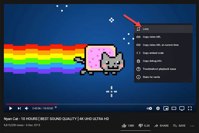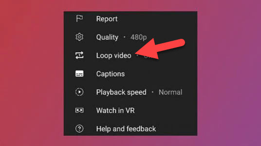 في إصدار اليوتوب للمتصفح على الحاسوب ، كان من الممكن ، لفترة طويلة ، تشغيل مقاطع الفيديو بشكل متكرر. فقط انقر بزر الماوس الأيمن على الفيديو وستجد الخيار في القائمة المنسدلة ، كما هو موضح في هذه الصورة: