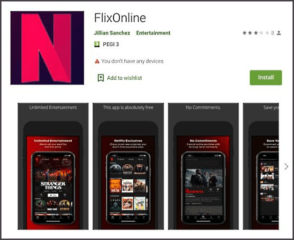 تم تقديم FlixOnline كتطبيق وصول مجاني إلى منصة البث نيتفليكس ، مما تسبب في اهتمام العديد من الأشخاص به وانتهى بهم الأمر في الوقوع في الفخ. في الواقع ، تم تنزيل البرنامج أكثر من 500 مرة خلال الوقت الذي كان متاحًا فيه في متجر التطبيقات.