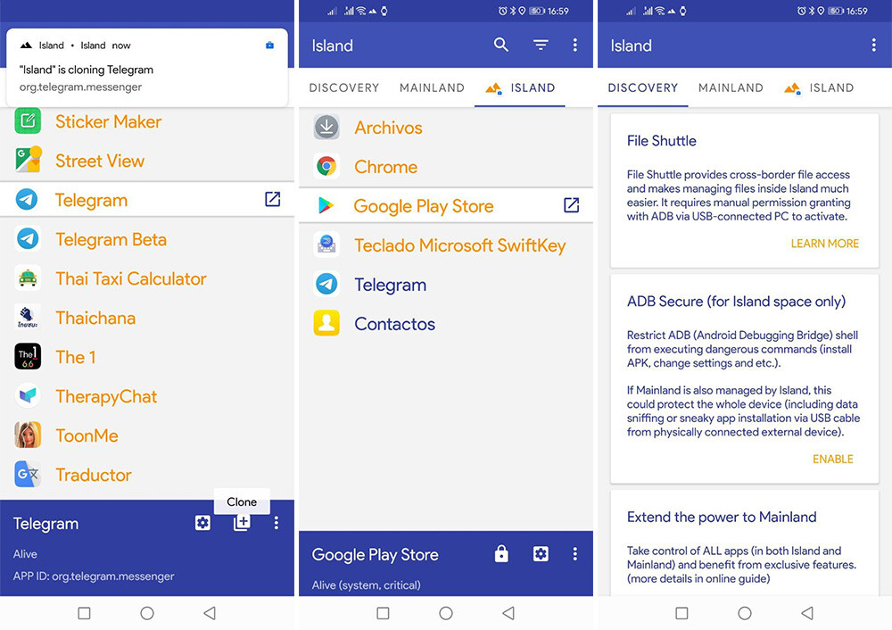 تعمل هذه الجزيرة كـ “صندوق رمل” ، بحيث لا تتمكن التطبيقات الموجودة بالداخل من الوصول إلى ما هو بالخارج ، والعكس صحيح. نظرًا لخصائصه ، قد يكون من المفيد استنساخ التطبيقات التي تسمح لك فقط باستخدام حساب واحد ، مثل واتساب ، واستخدام حسابين ، أو استخدام التطبيقات التي لا نثق بها .